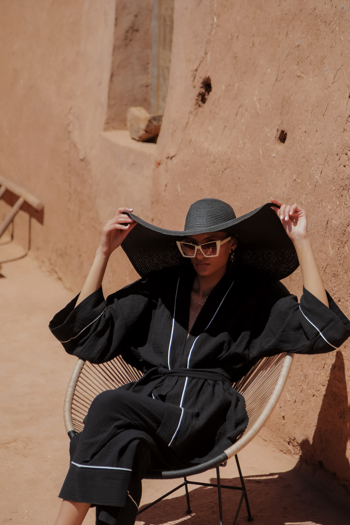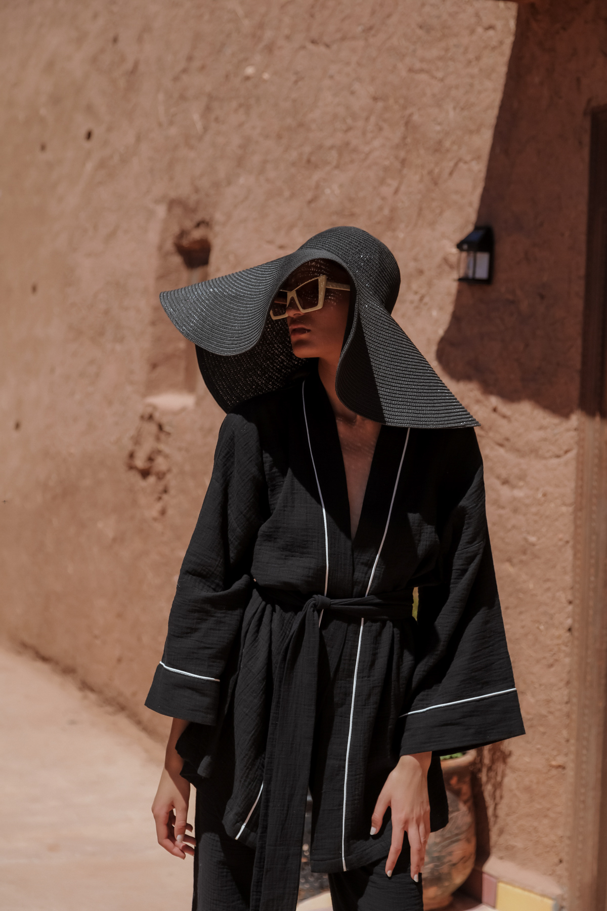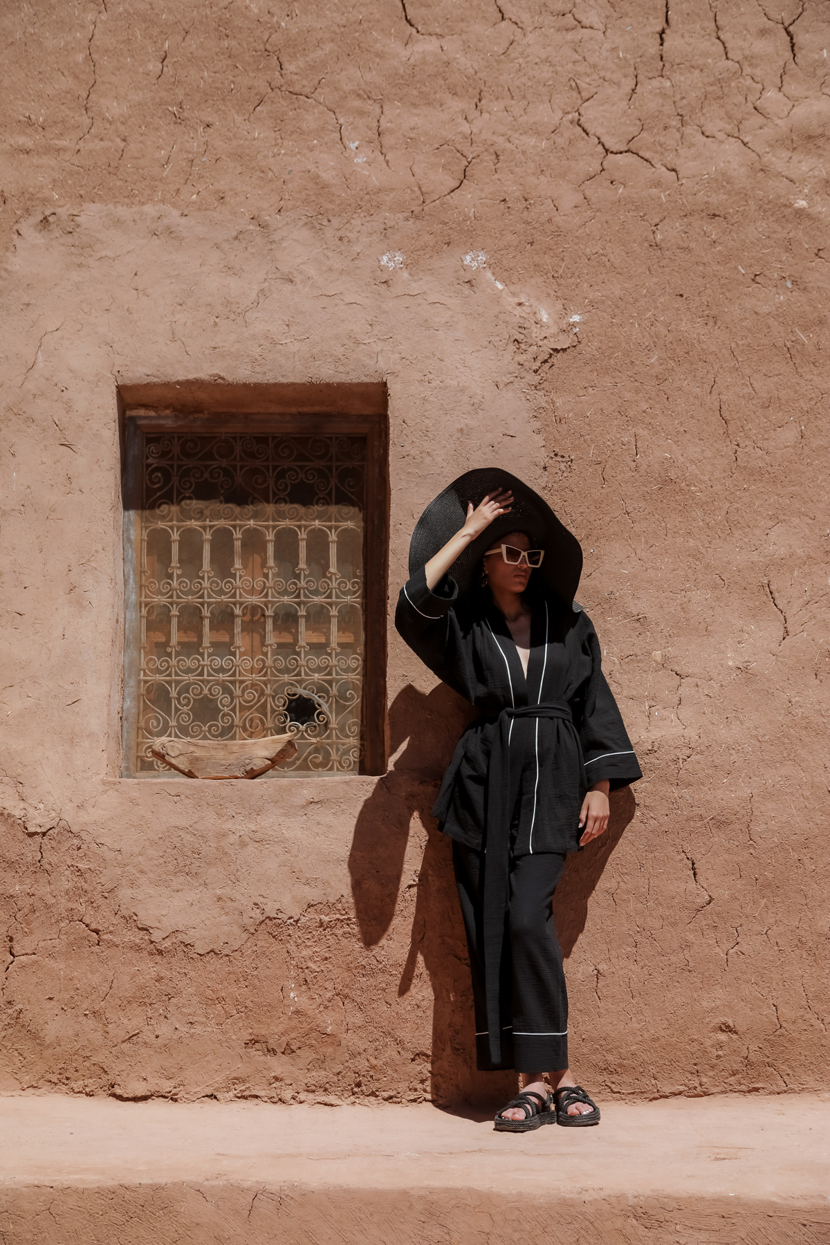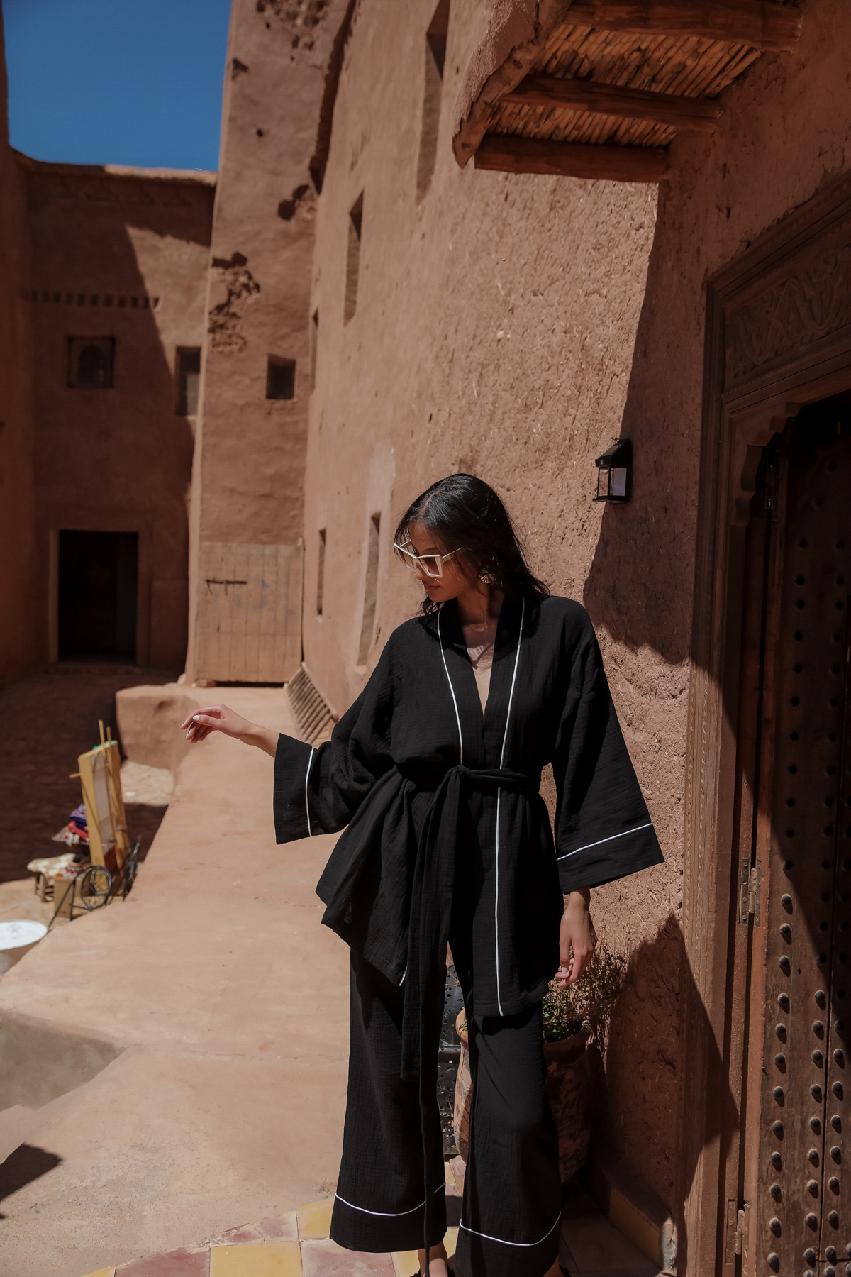 AMİRA Kısa Kimono ve Pantolon Takımı ile şıklığı tamamlayabilirsiniz. Yumuşak %100 Pamuk kumaşın ferahlığını hissedin ve siyah renk ile zarif ve sade bir görünüm elde edin. Pamuk biye detaylı tasarımı ile şıklığınıza şıklık katarken, Aït Benhaddou'nun büyüleyici havasıyla ruhunuza bir ziyafet çekin. AMİRA Kısa Kimono ve Pantolon Takımı, günlük hayatınızda ve özel günlerinizde keyifle kullanabileceğiniz mükemmel bir parçadır. JessyWell'in Marrakech Reverie SS24 koleksiyonunun bir parçası olan bu ürün ile "Özgür ol, kendin ol, doğayla uyum içinde ol." sloganını yaşayın.