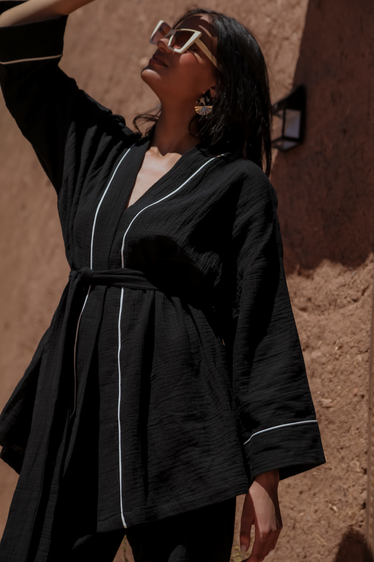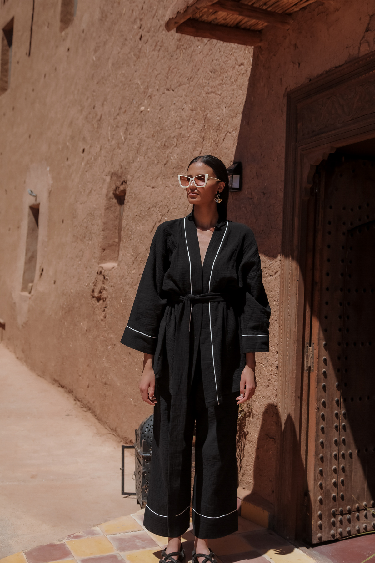 AMİRA %100 Pamuk Siyah Kısa Kimono ve Pantolon TAKIM