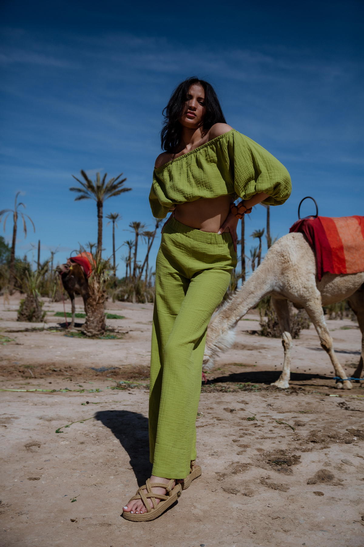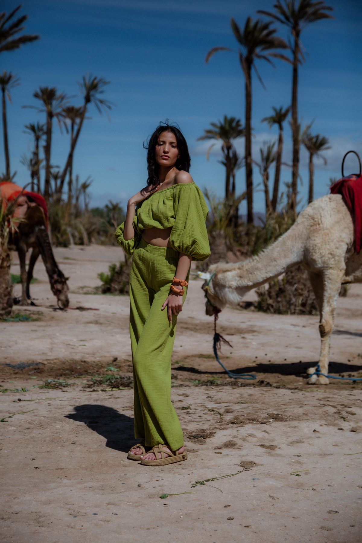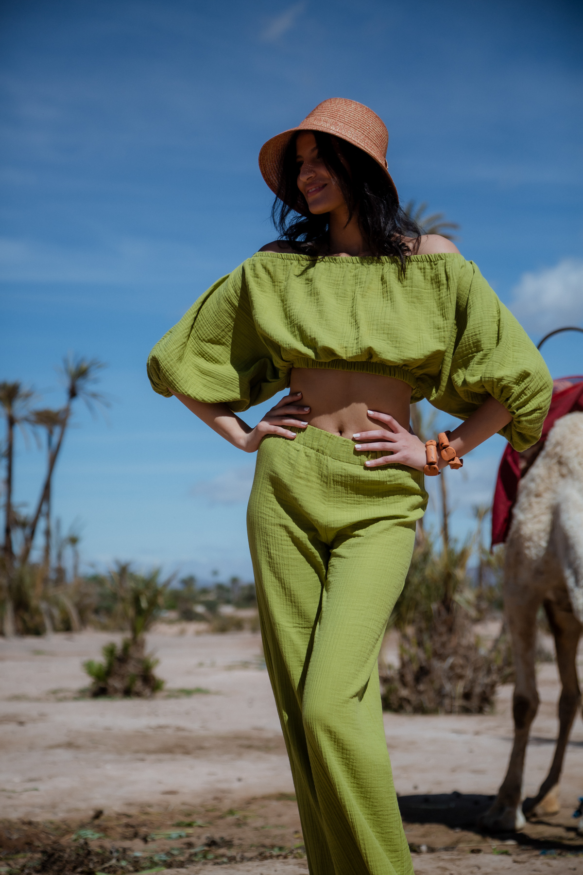 DUNİA %100 Pamuk Yeşil Karpuz Kollu Crop ve Palazzo Pantolon TAKIM