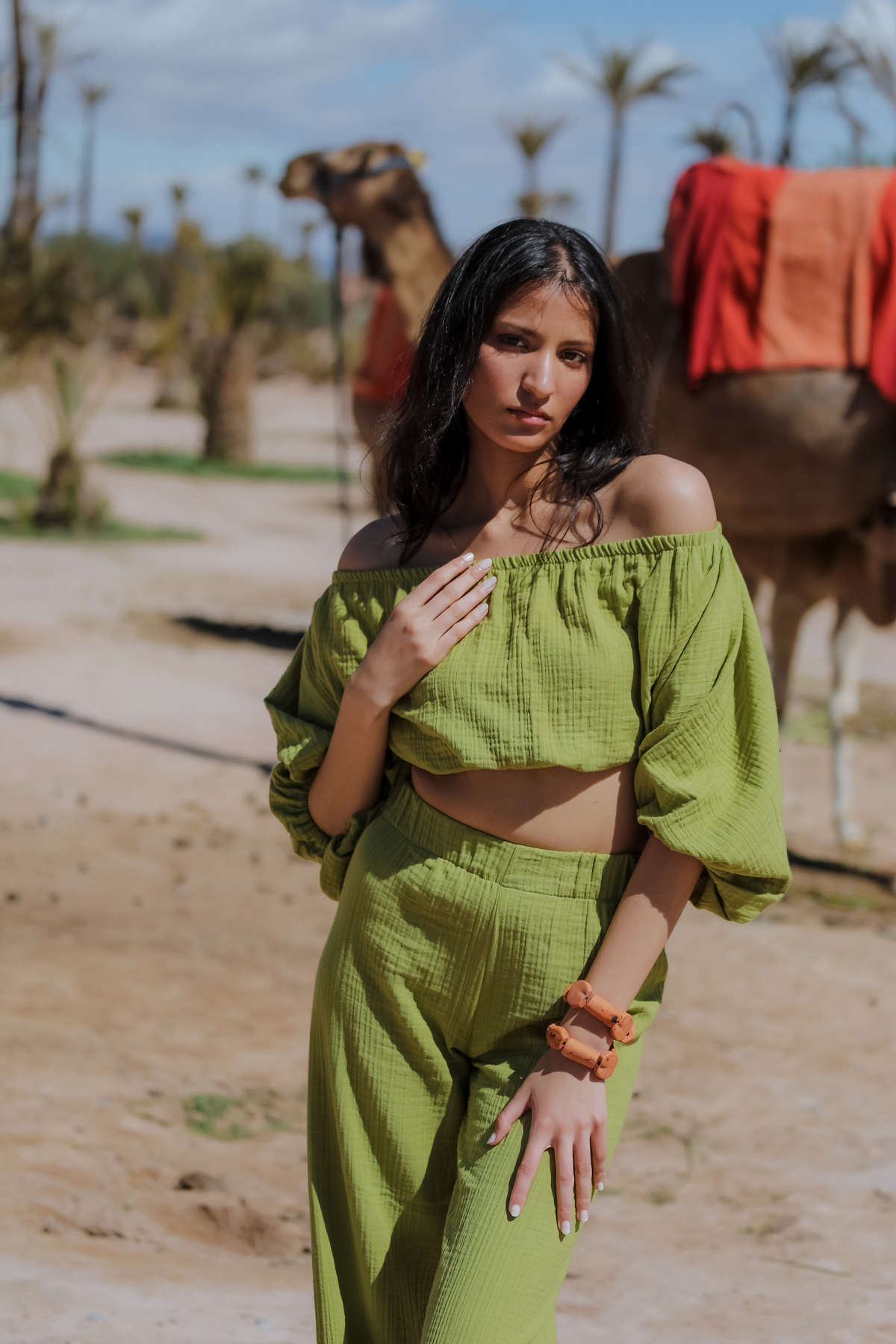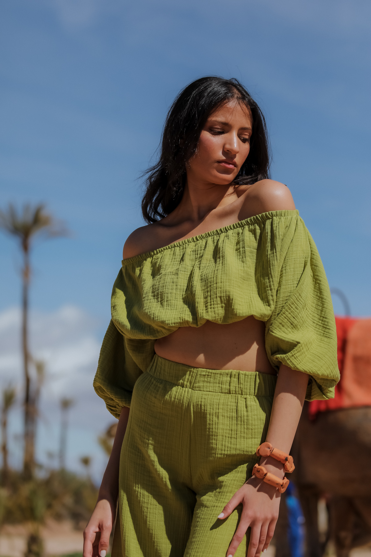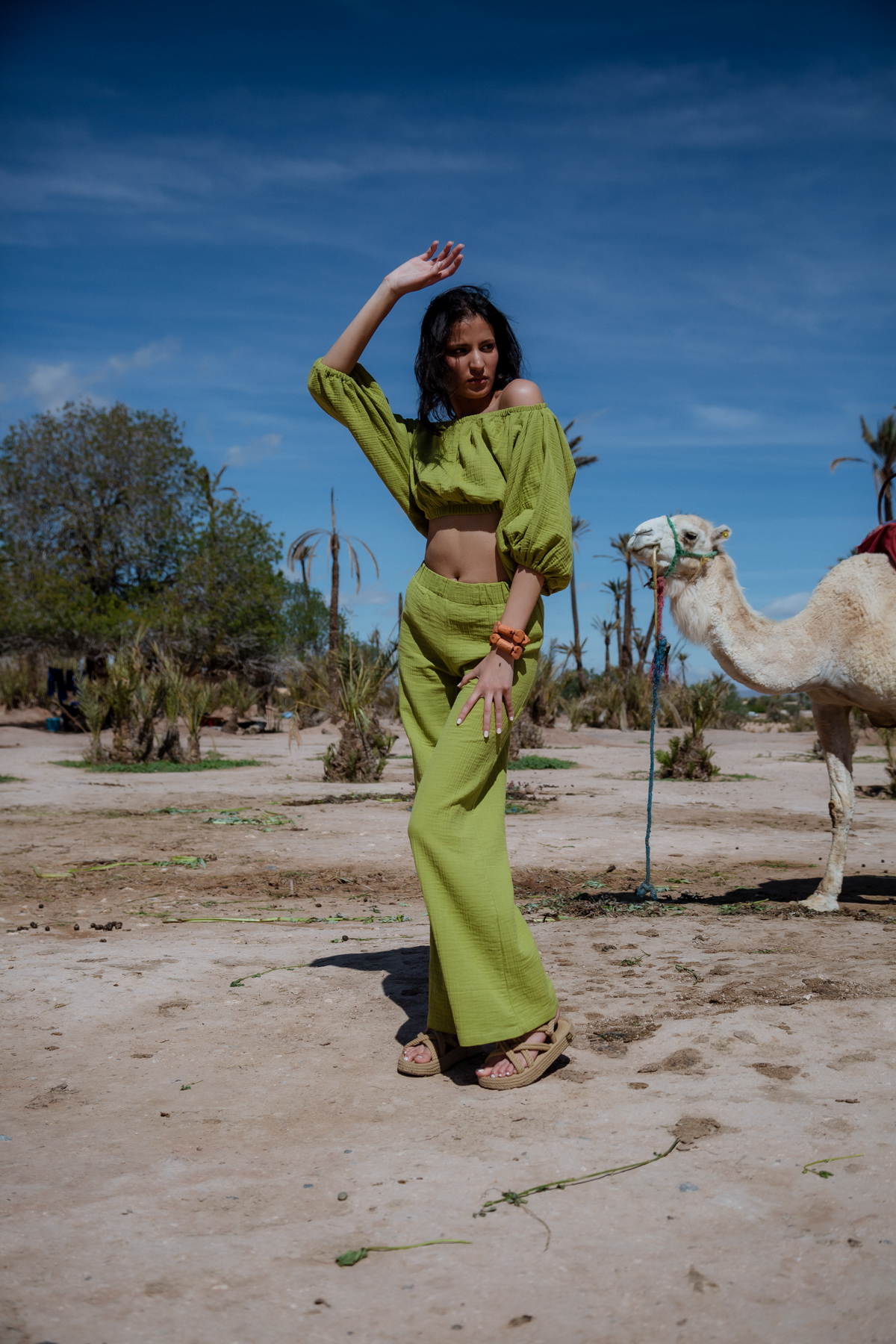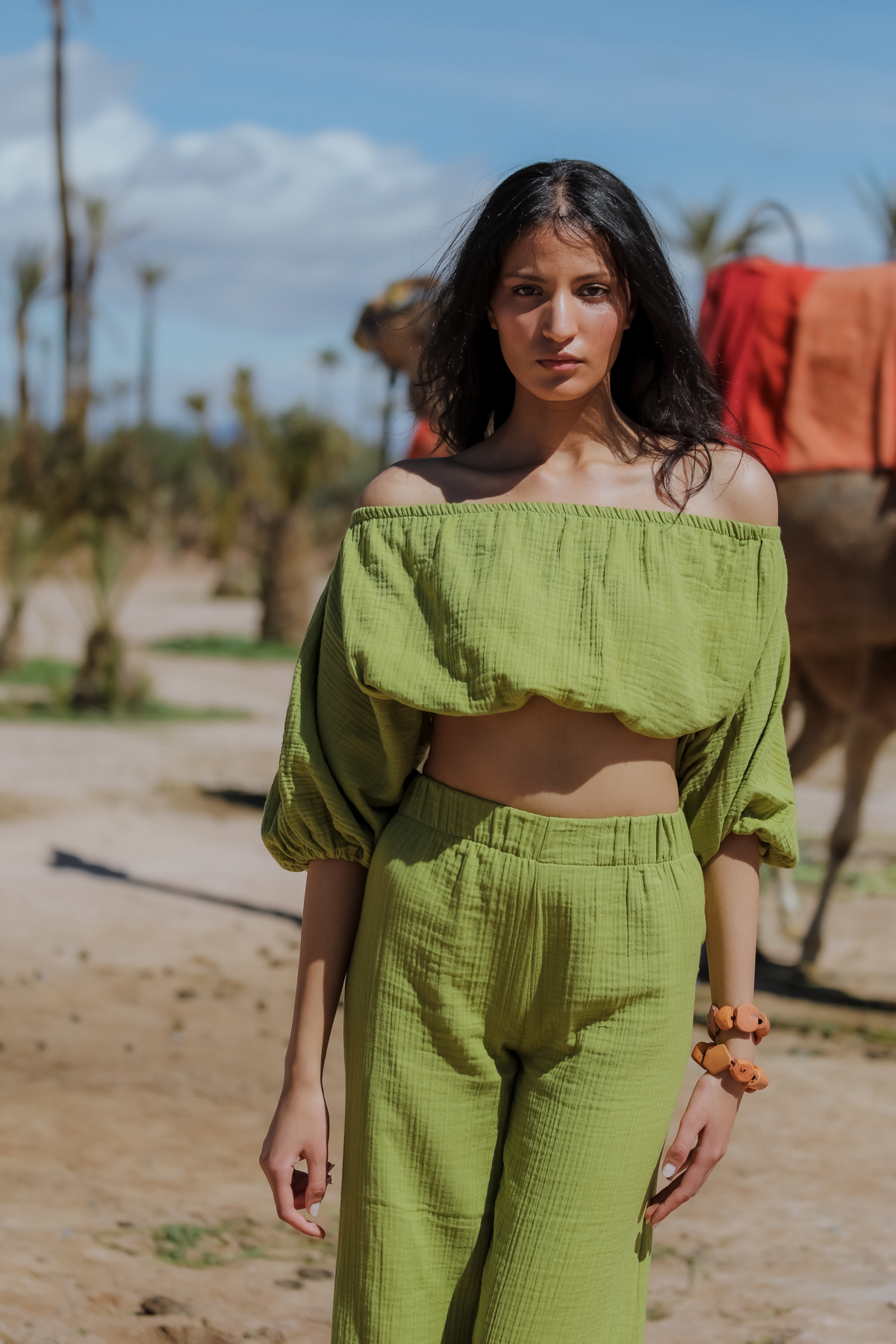 DUNİA %100 Pamuk Yeşil Karpuz Kollu Crop ve Palazzo Pantolon TAKIM