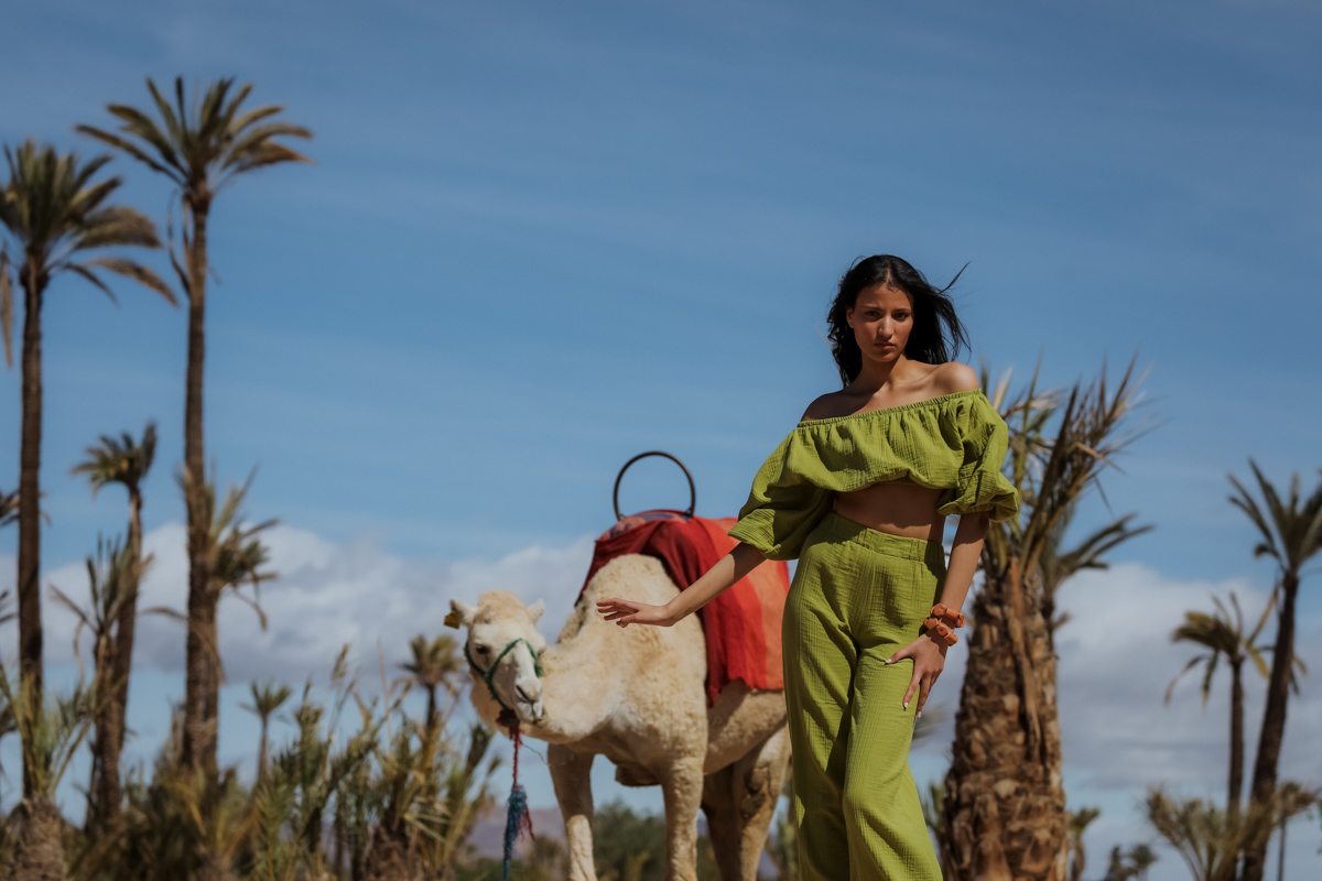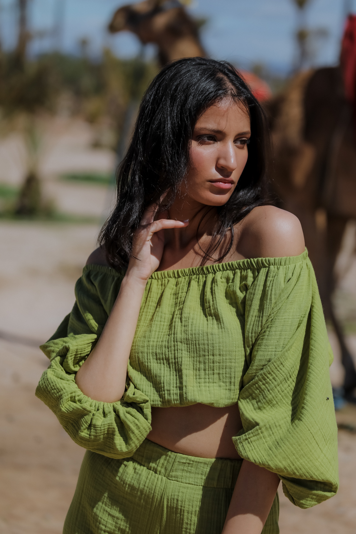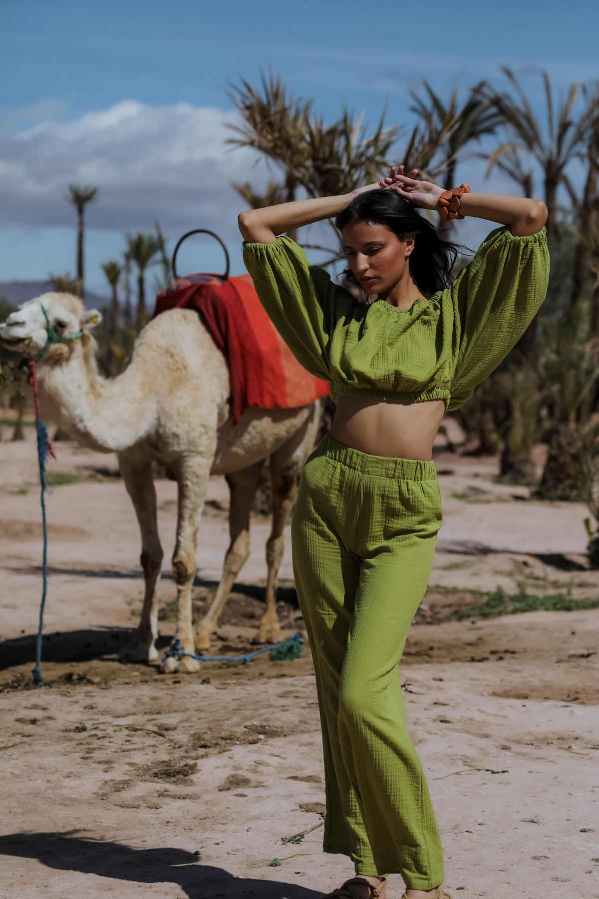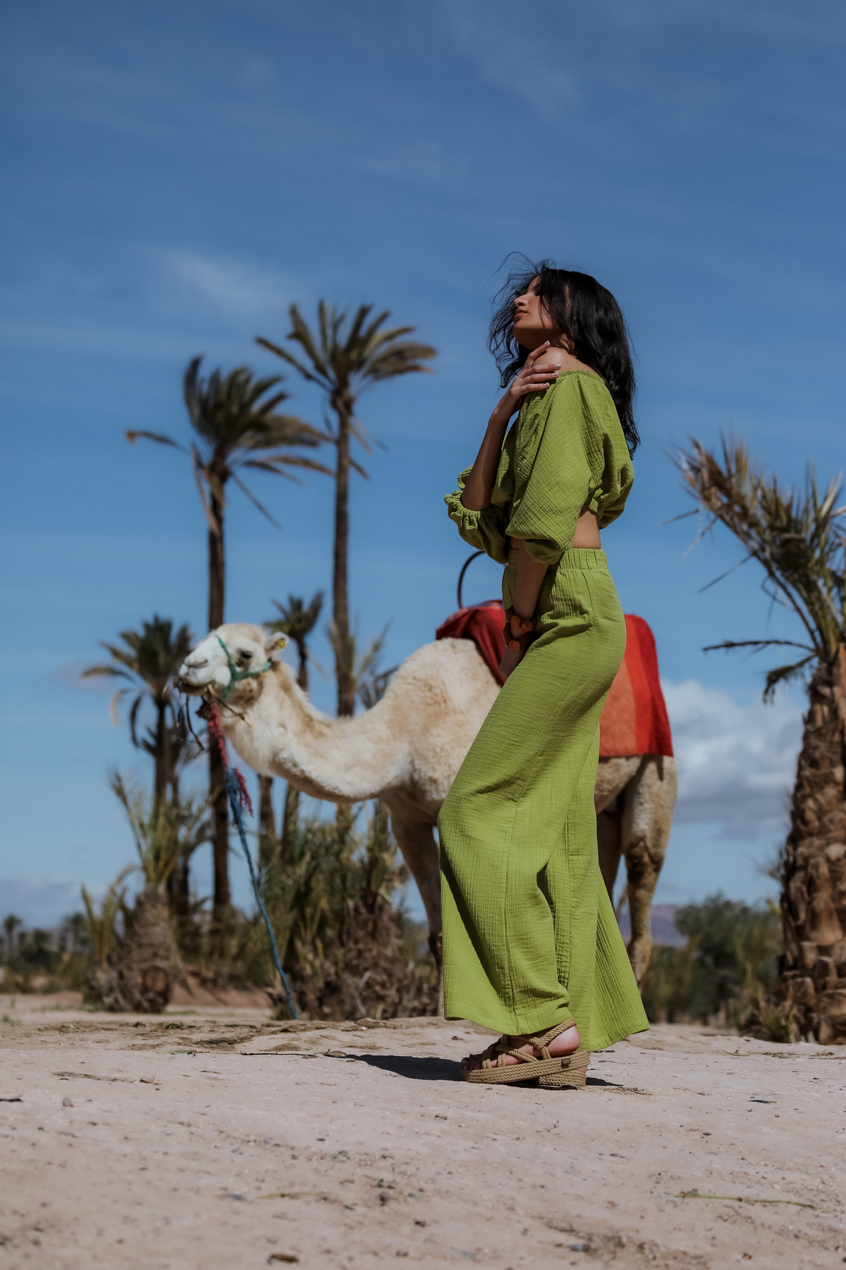 Marakeş'in büyülü atmosferini hissetmeye hazır mısınız? DUNİA Crop ve Pantolon Takımı ile serin ve konforlu bir yaz stili yaratabilirsiniz. Yumuşak %100 Pamuk kumaşın ferahlığını hissedin ve yağ yeşili renk ile zarif ve sade bir görünüm elde edin. Tasarımı ile şıklığınıza şıklık katarken, Marakeş'in büyüleyici havasıyla ruhunuza bir ziyafet çekin. DUNİA Crop ve Pantolon Takımı, günlük hayatınızda ve özel günlerinizde keyifle kullanabileceğiniz mükemmel bir parçadır. JessyWell'in Marrakech Reverie SS24 koleksiyonunun bir parçası olan bu ürün ile "Özgür ol, kendin ol, doğayla uyum içinde ol." sloganını yaşayın.