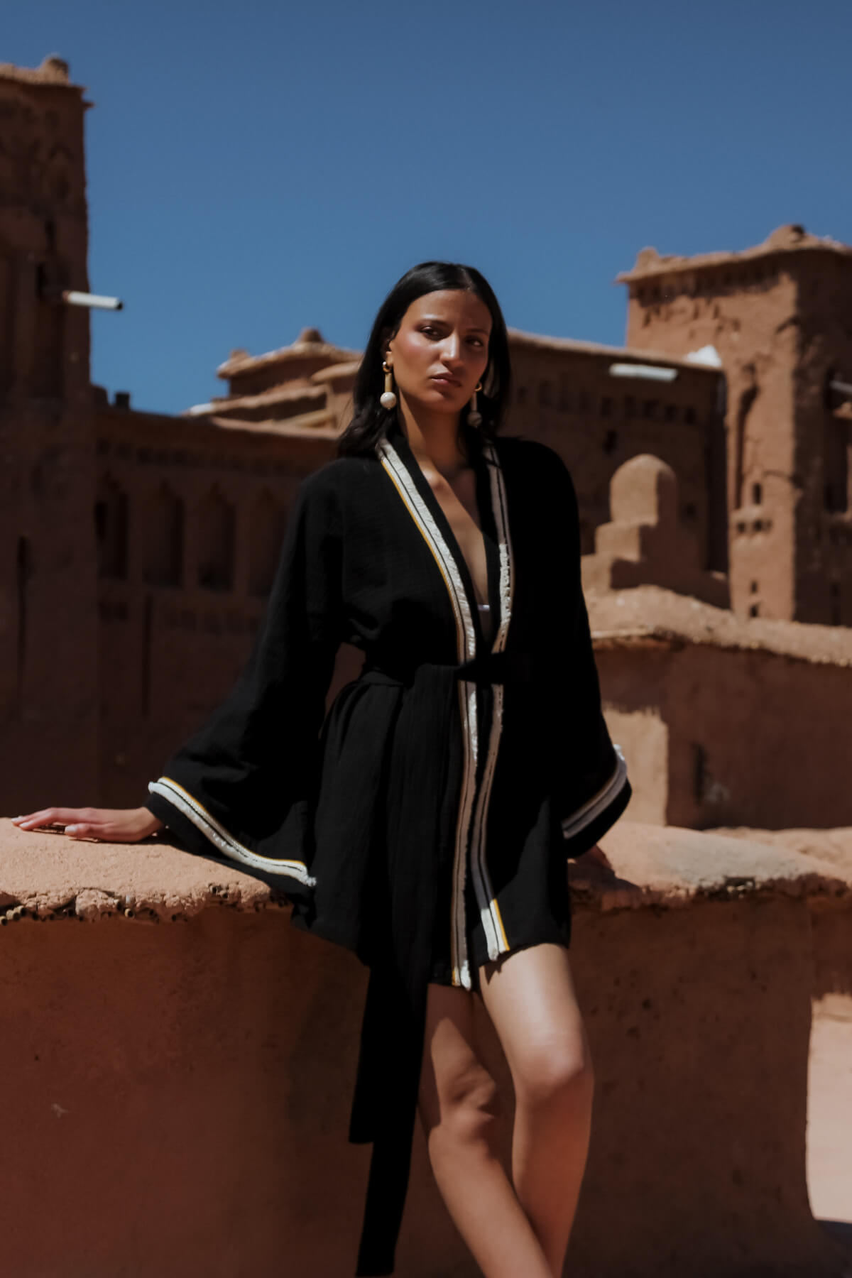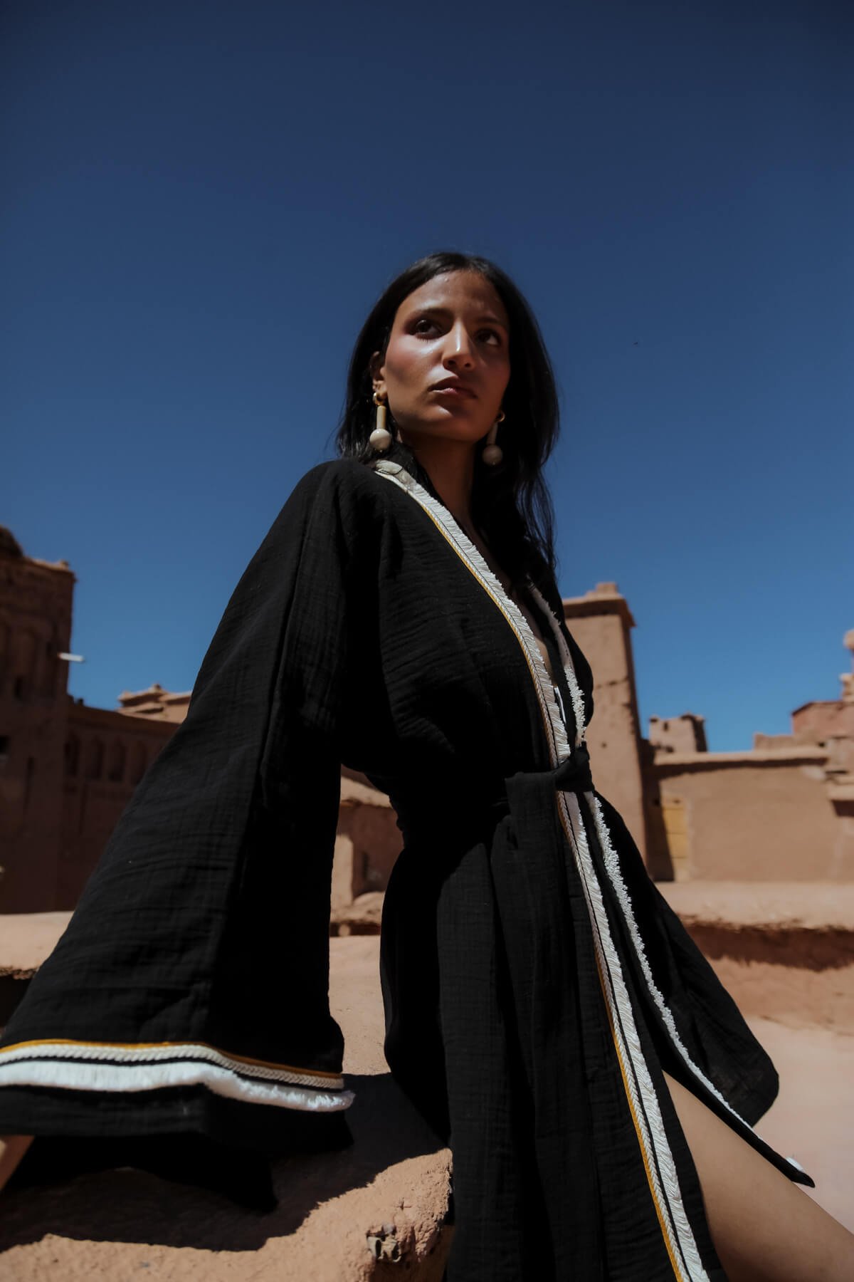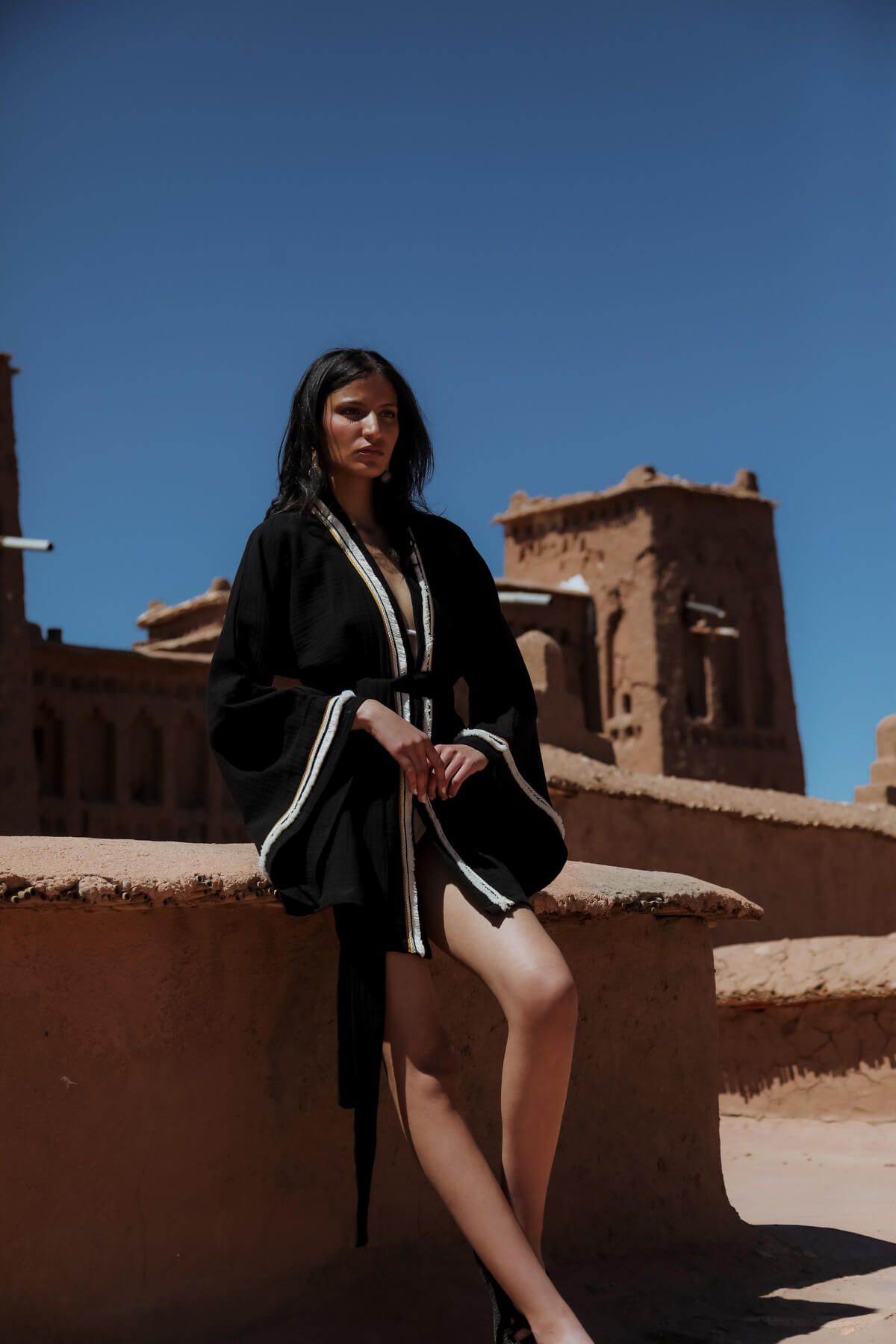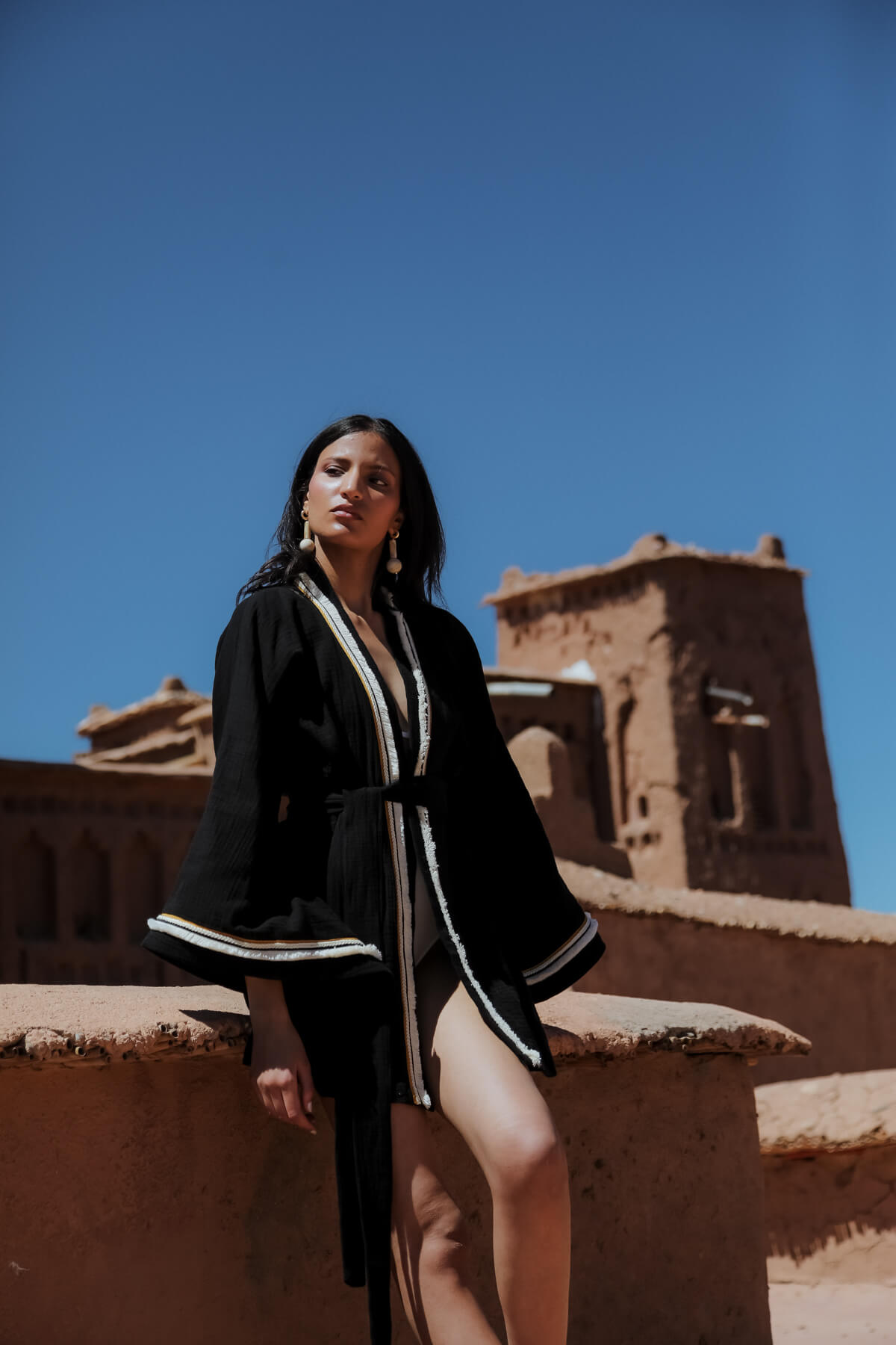 Marakeş'in büyülü atmosferini hissetmeye hazır mısınız? JANNA Püsküllü Kimono ile serin ve konforlu bir yaz stili yaratabilirsiniz. Yumuşak %100 Pamuk kumaşın ferahlığını hissedin ve siyah renk ile zarif ve sade bir görünüm elde edin. Püskül detaylı ve biyeli tasarımı ile şıklığınıza şıklık katarken, Aït Benhaddou'nun büyüleyici havasıyla ruhunuza bir ziyafet çekin. JANNA Püsküllü Kimono, günlük hayatınızda ve özel günlerinizde keyifle kullanabileceğiniz mükemmel bir parçadır. JessyWell'in Marrakech Reverie SS24 koleksiyonunun bir parçası olan bu ürün ile "Özgür ol, kendin ol, doğayla uyum içinde ol." sloganını yaşayın.