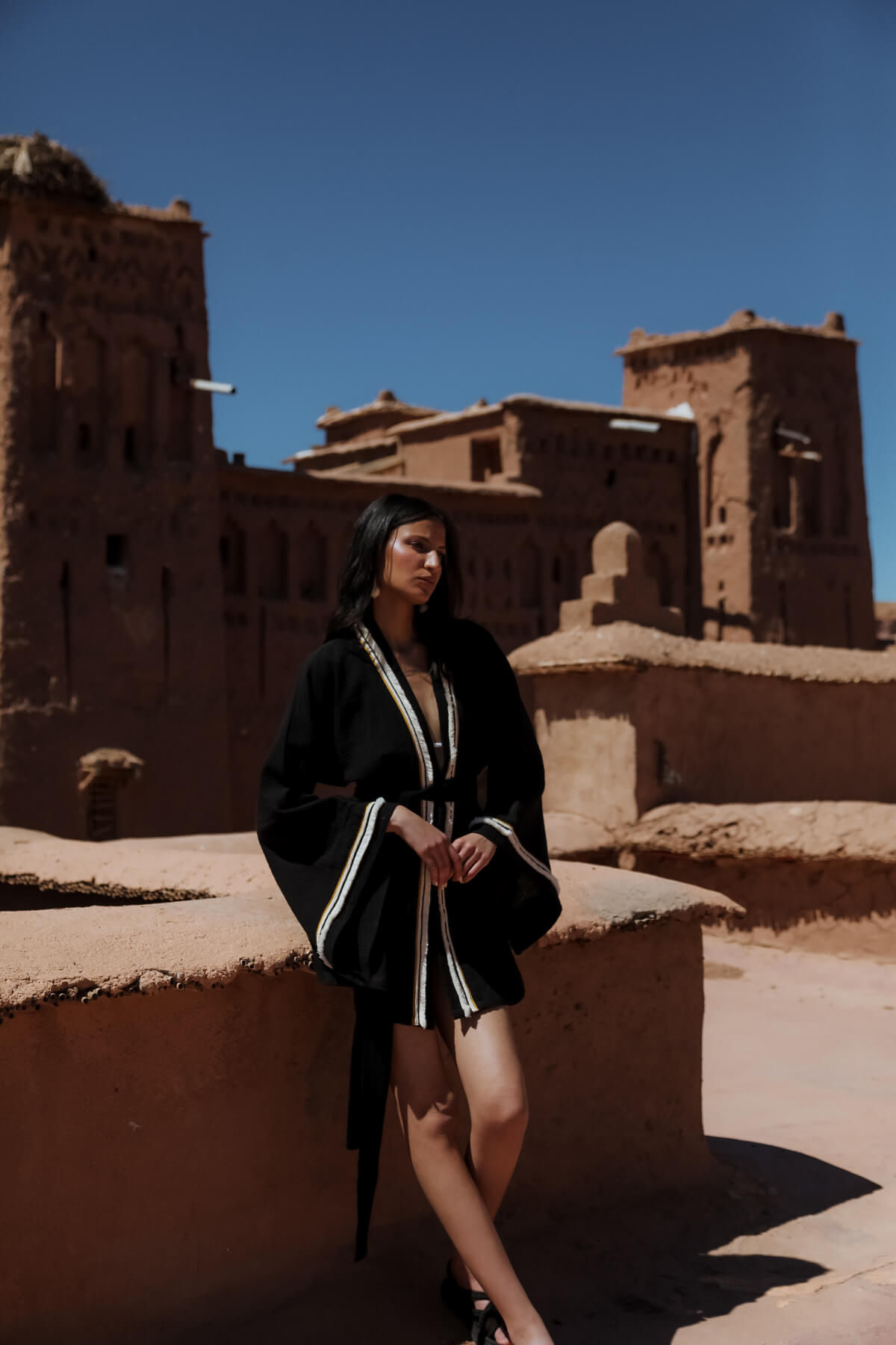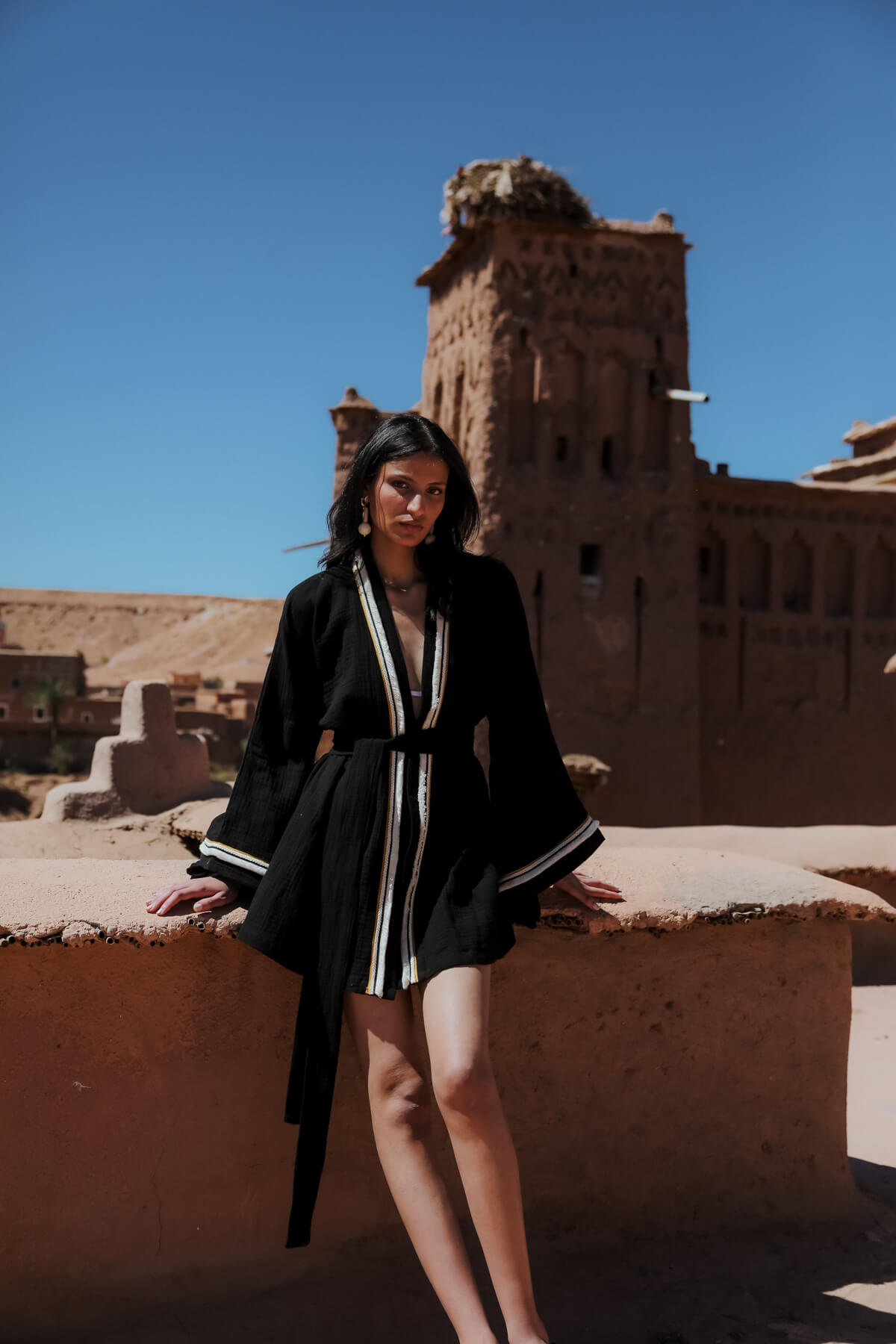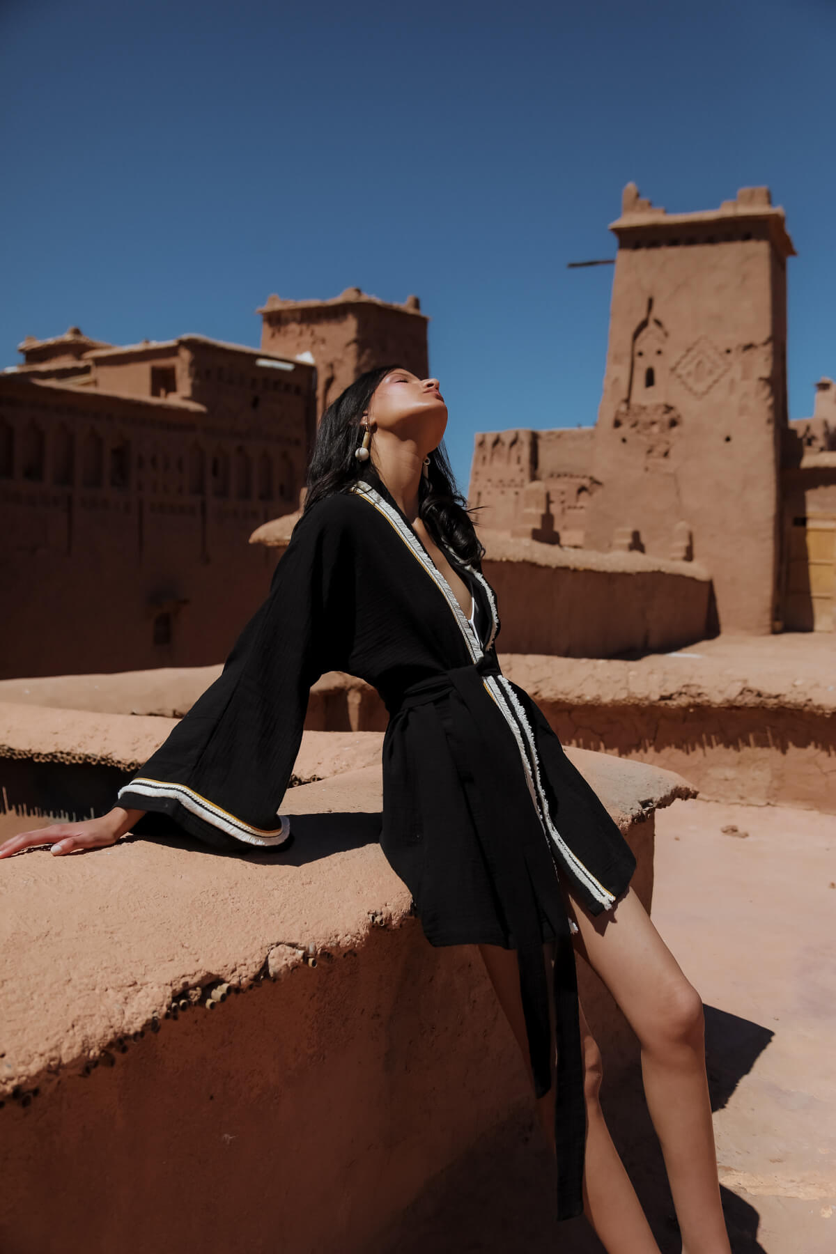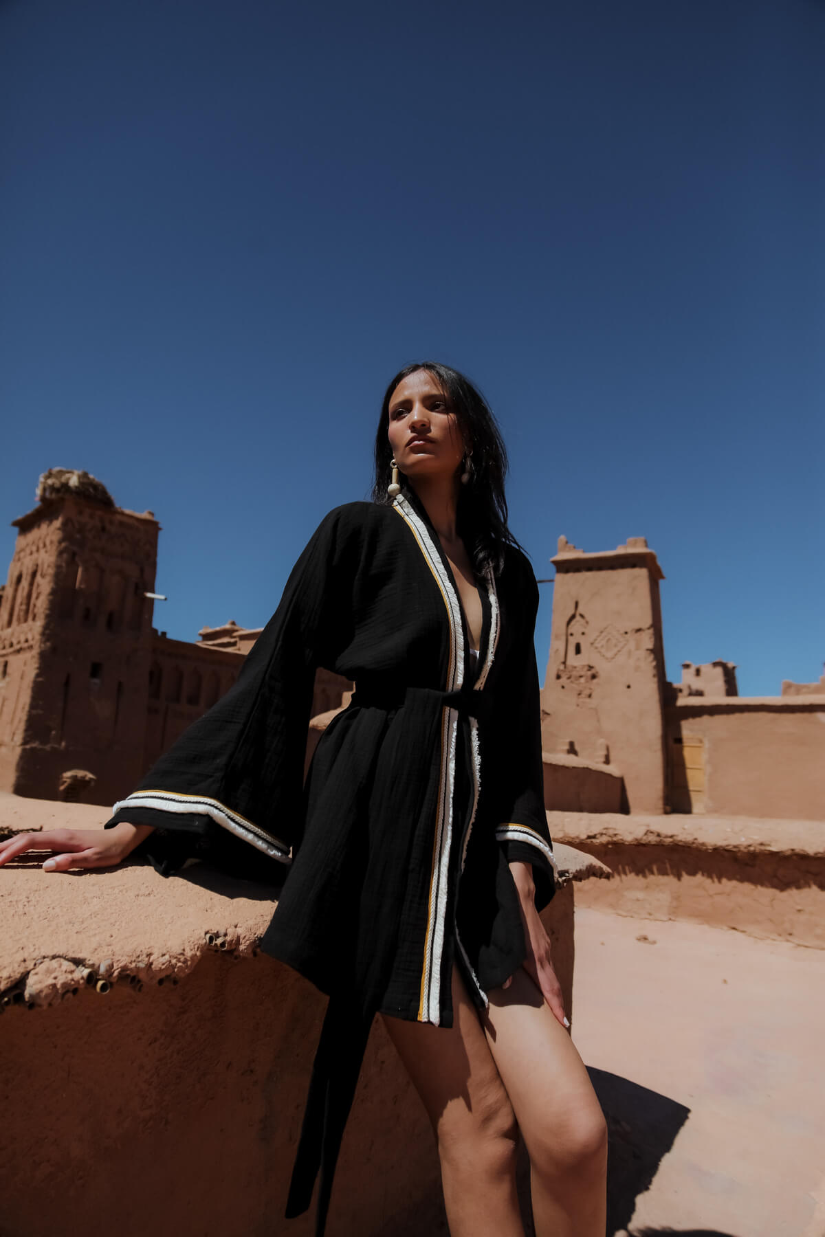 Marakeş'in büyülü atmosferini hissetmeye hazır mısınız? JANNA Püsküllü Kimono ile serin ve konforlu bir yaz stili yaratabilirsiniz. Yumuşak %100 Pamuk kumaşın ferahlığını hissedin ve siyah renk ile zarif ve sade bir görünüm elde edin. Püskül detaylı ve biyeli tasarımı ile şıklığınıza şıklık katarken, Aït Benhaddou'nun büyüleyici havasıyla ruhunuza bir ziyafet çekin. JANNA Püsküllü Kimono, günlük hayatınızda ve özel günlerinizde keyifle kullanabileceğiniz mükemmel bir parçadır. JessyWell'in Marrakech Reverie SS24 koleksiyonunun bir parçası olan bu ürün ile "Özgür ol, kendin ol, doğayla uyum içinde ol." sloganını yaşayın.