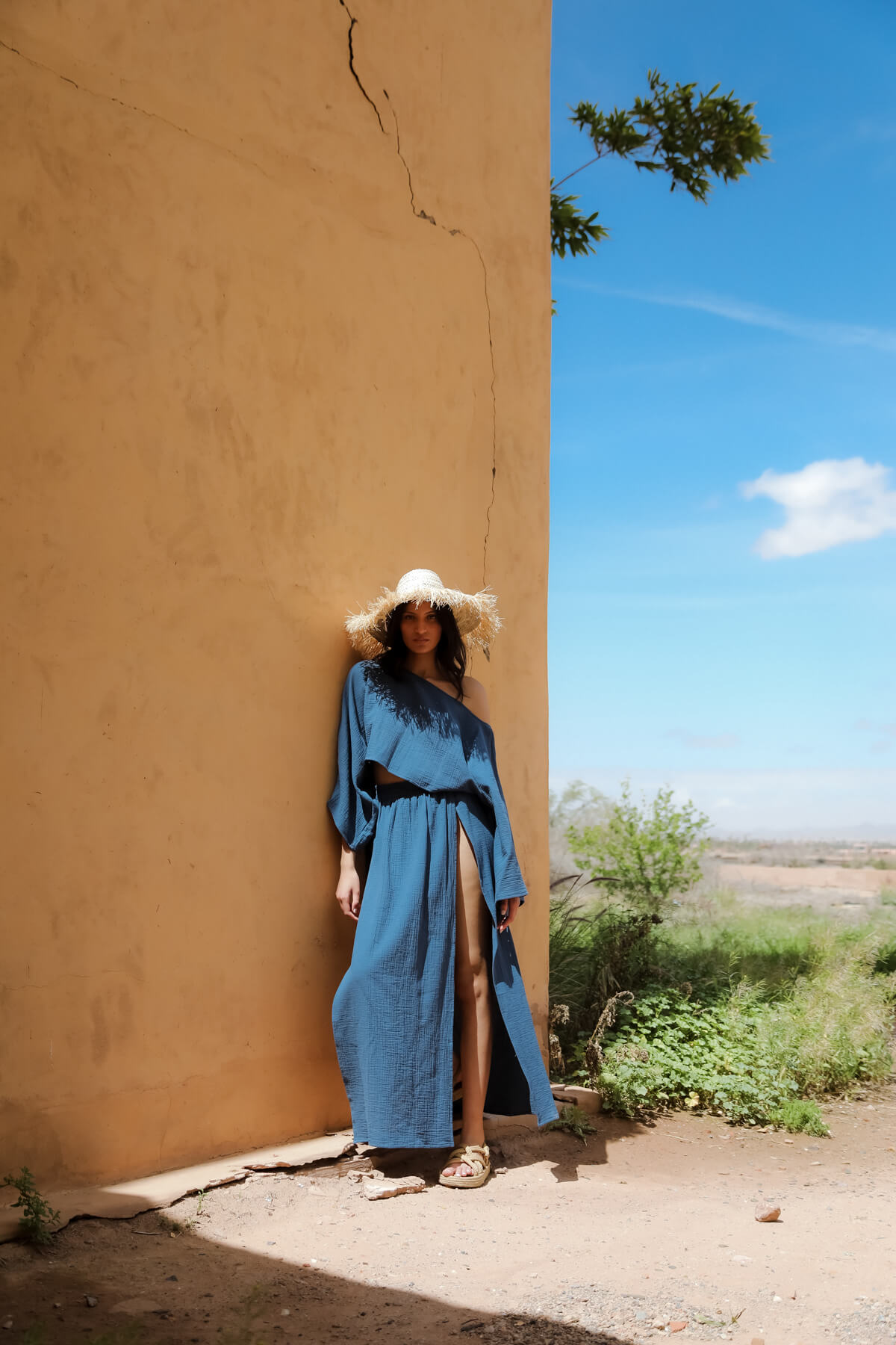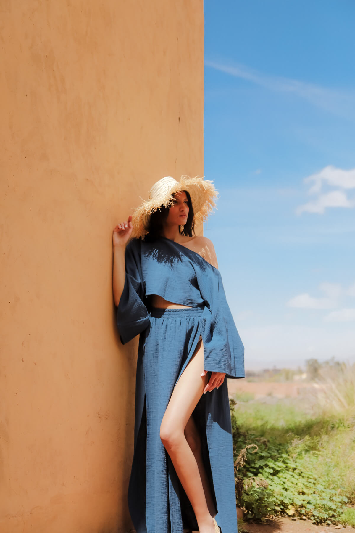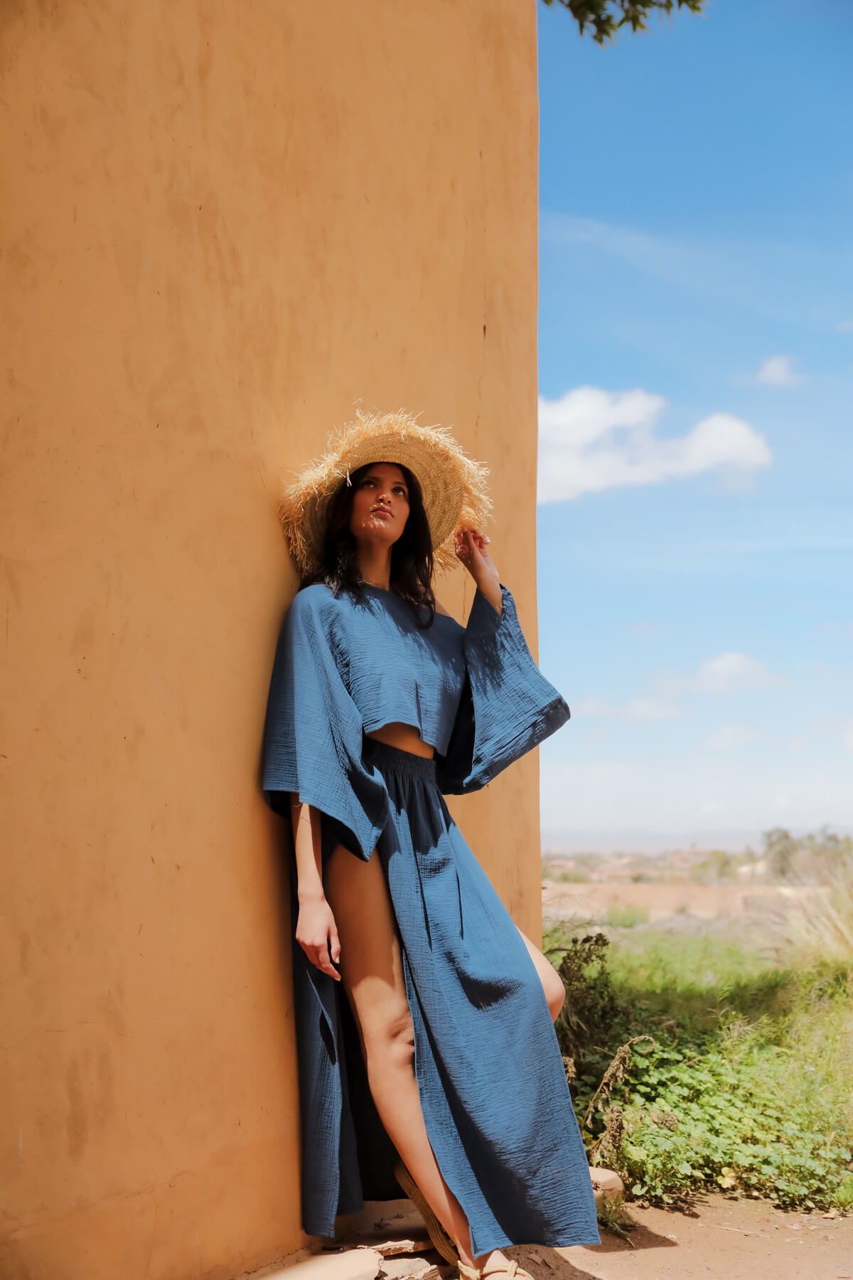 Marakeş'in büyülü atmosferini hissetmeye hazır mısınız? LEILA Pamuk Crop ve Yırtmaçlı Etek Takımı ile serin ve konforlu bir yaz stili yaratabilirsiniz. Yumuşak %100 Pamuk kumaşın ferahlığını hissedin ve indigo renk ile zarif ve sade bir görünüm elde edin. Tasarımı ile şıklığınıza şıklık katarken, Marakeş Palace'ın büyüleyici havasıyla ruhunuza bir ziyafet çekin. LEILA Pamuk Crop ve Yırtmaçlı Etek Takımı, günlük hayatınızda ve özel günlerinizde keyifle kullanabileceğiniz mükemmel bir parçadır. JessyWell'in Marrakech Reverie SS24 koleksiyonunun bir parçası olan bu ürün ile "Özgür ol, kendin ol, doğayla uyum içinde ol." sloganını yaşayın.