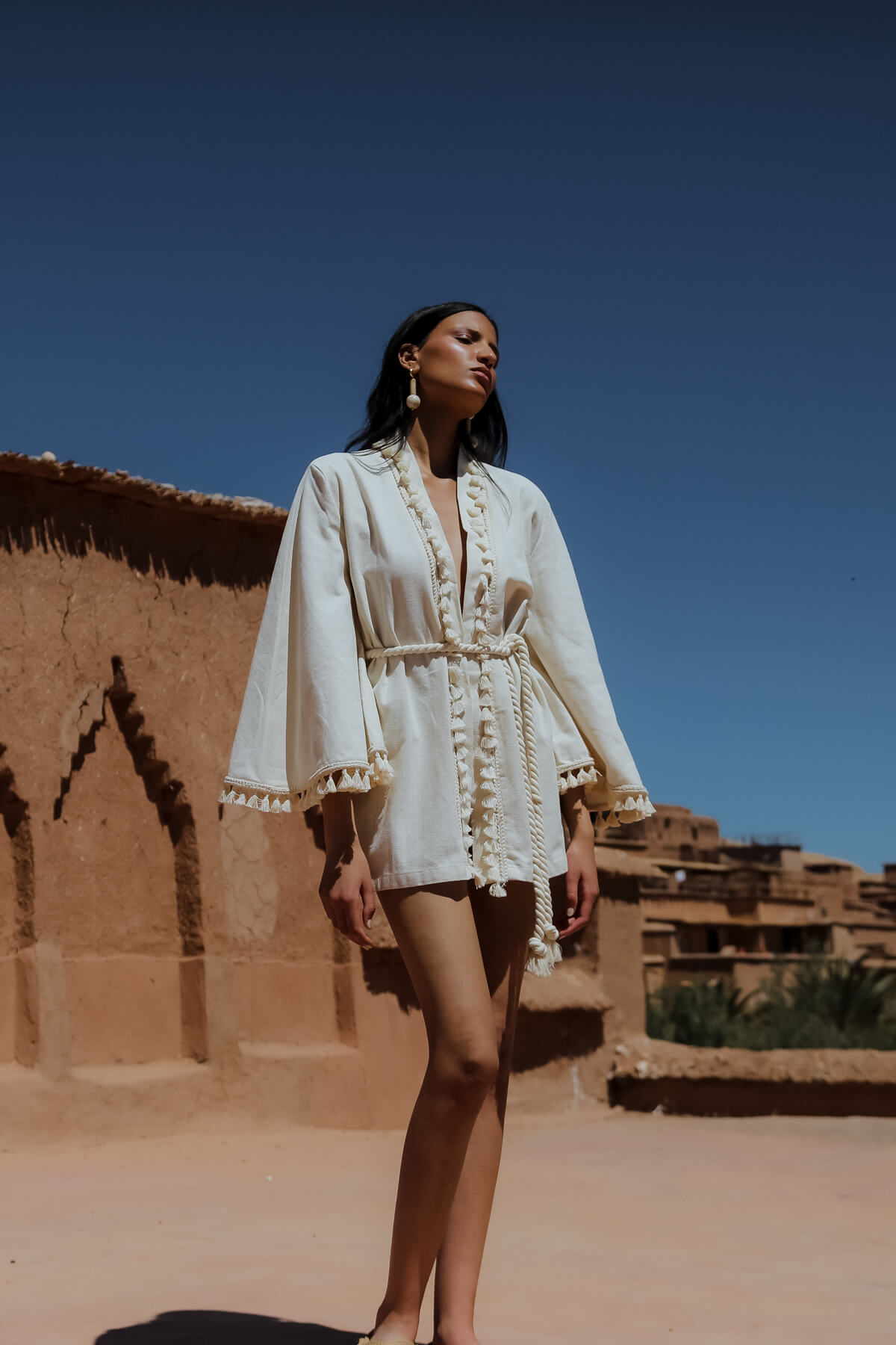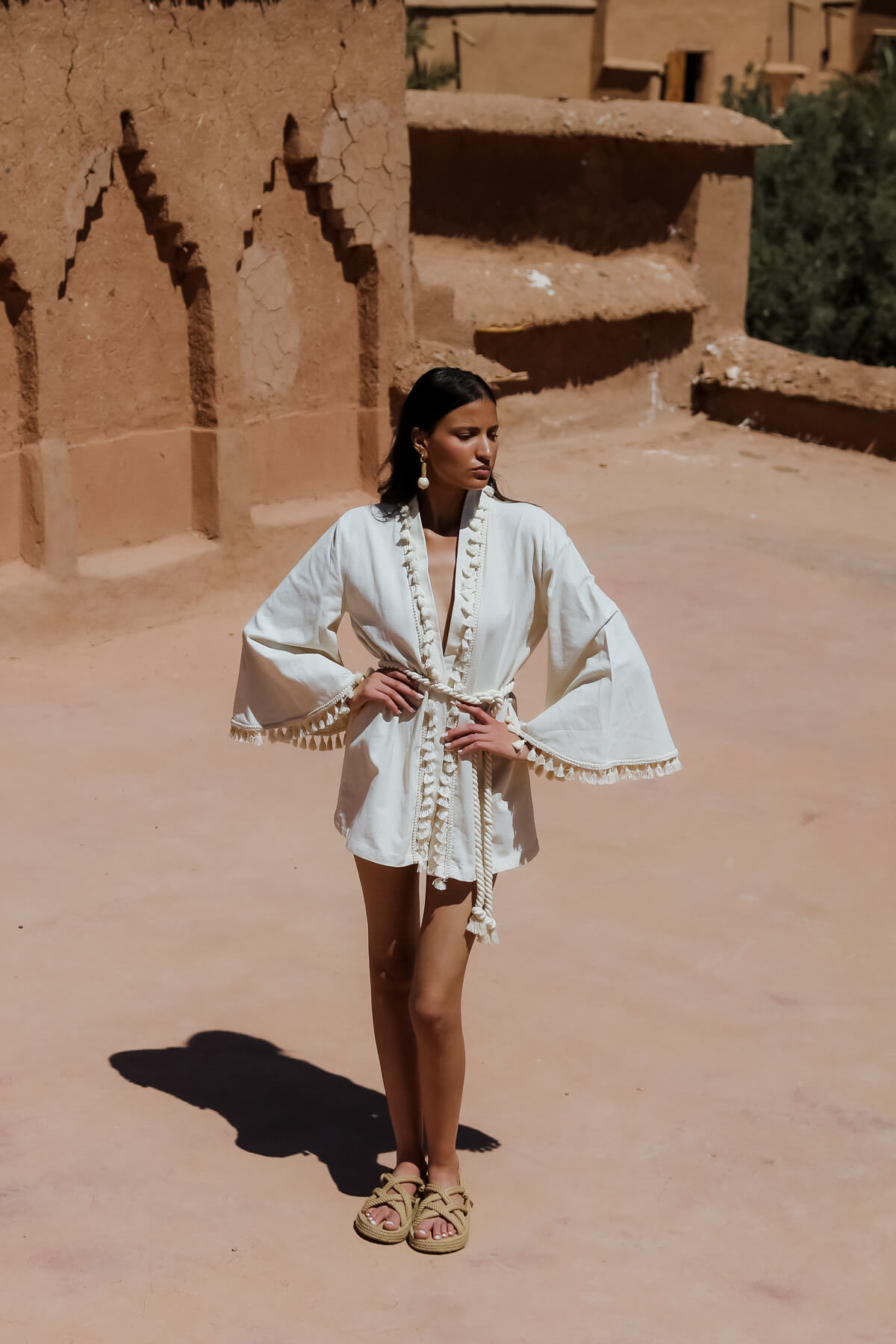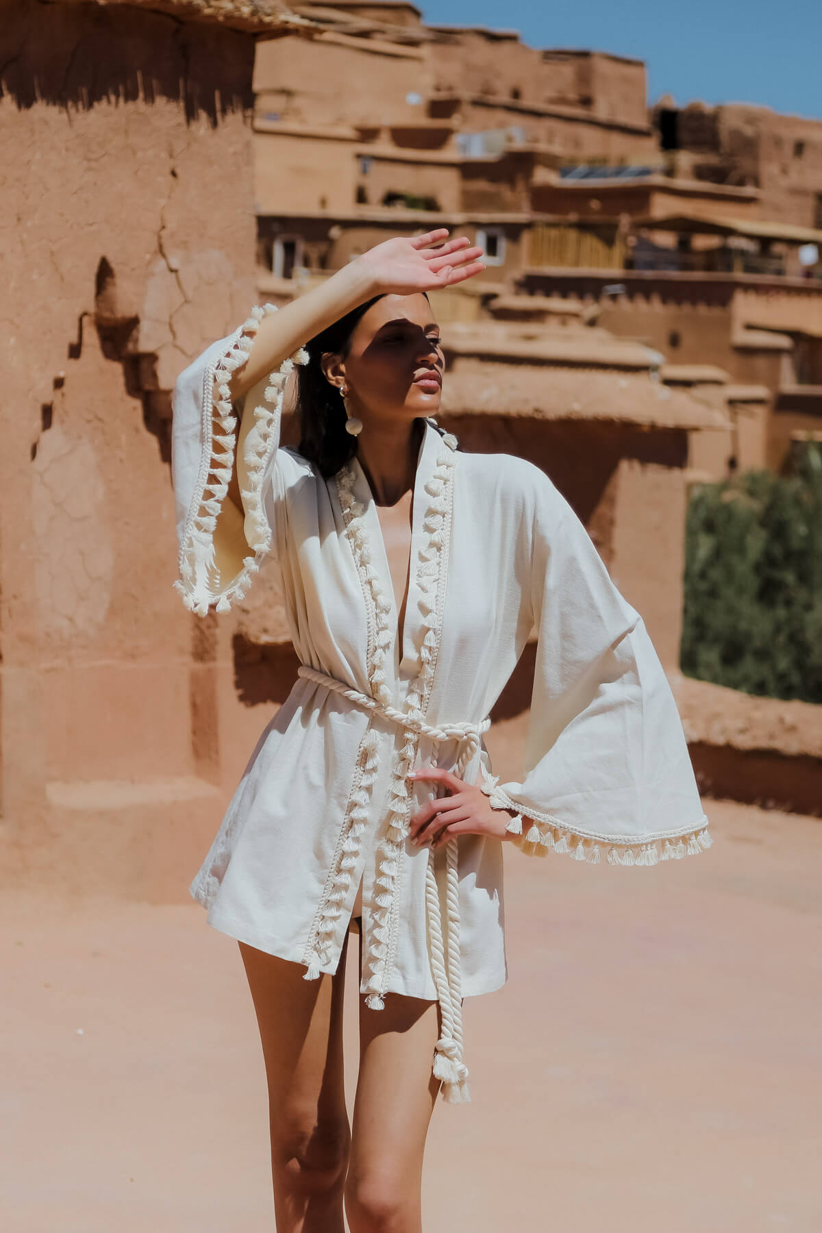 Marakeş'in büyülü atmosferini hissetmeye hazır mısınız? LOUBNA Püsküllü Kimono ile serin ve konforlu bir yaz stili yaratabilirsiniz. Yumuşak %60 Pamuk %40 Keten kumaşın ferahlığını hissedin ve ekru renk ile zarif ve sade bir görünüm elde edin. Püskül detaylı ve halat kuşaklı tasarımı ile şıklığınıza şıklık katarken, Aït Benhaddou'nun büyüleyici havasıyla ruhunuza bir ziyafet çekin. LOUBNA Püsküllü Kimono, günlük hayatınızda ve özel günlerinizde keyifle kullanabileceğiniz mükemmel bir parçadır. JessyWell'in Marrakech Reverie SS24 koleksiyonunun bir parçası olan bu ürün ile "Özgür ol, kendin ol, doğayla uyum içinde ol." sloganını yaşayın.
