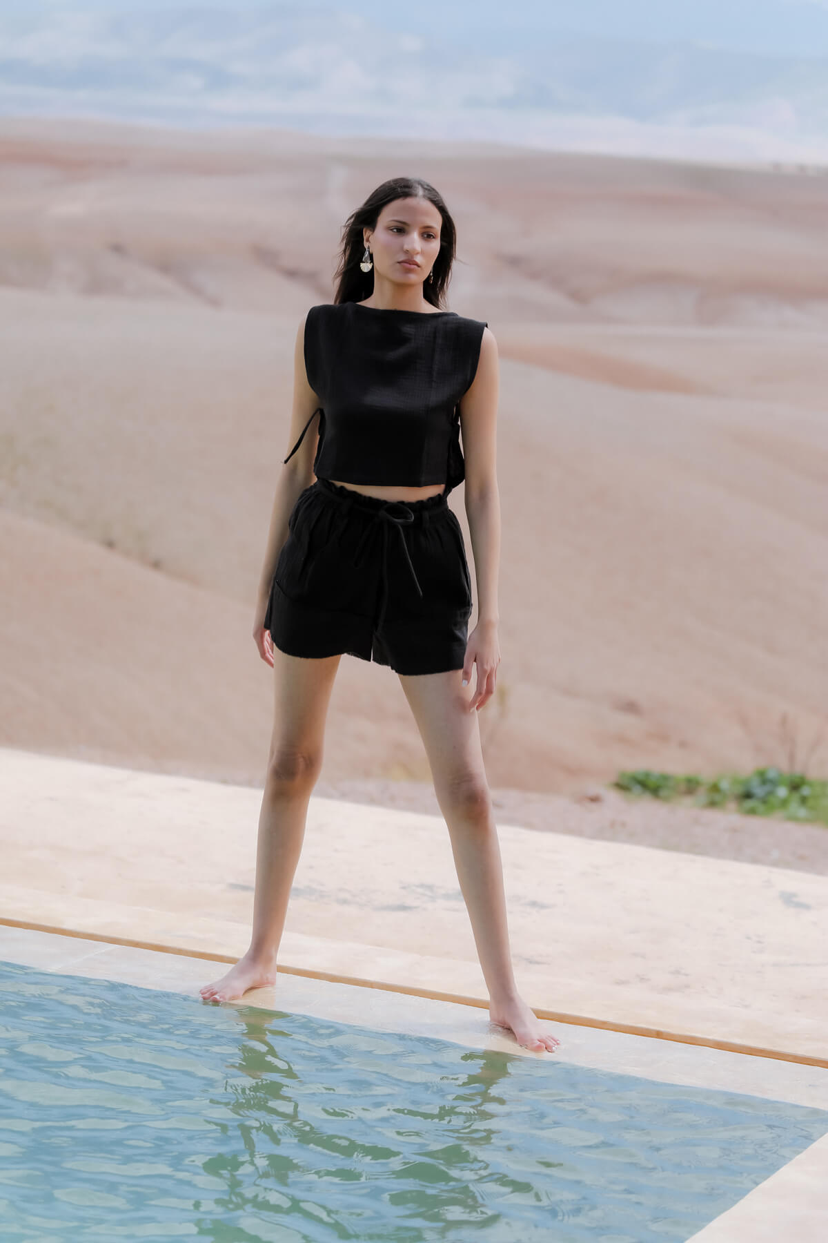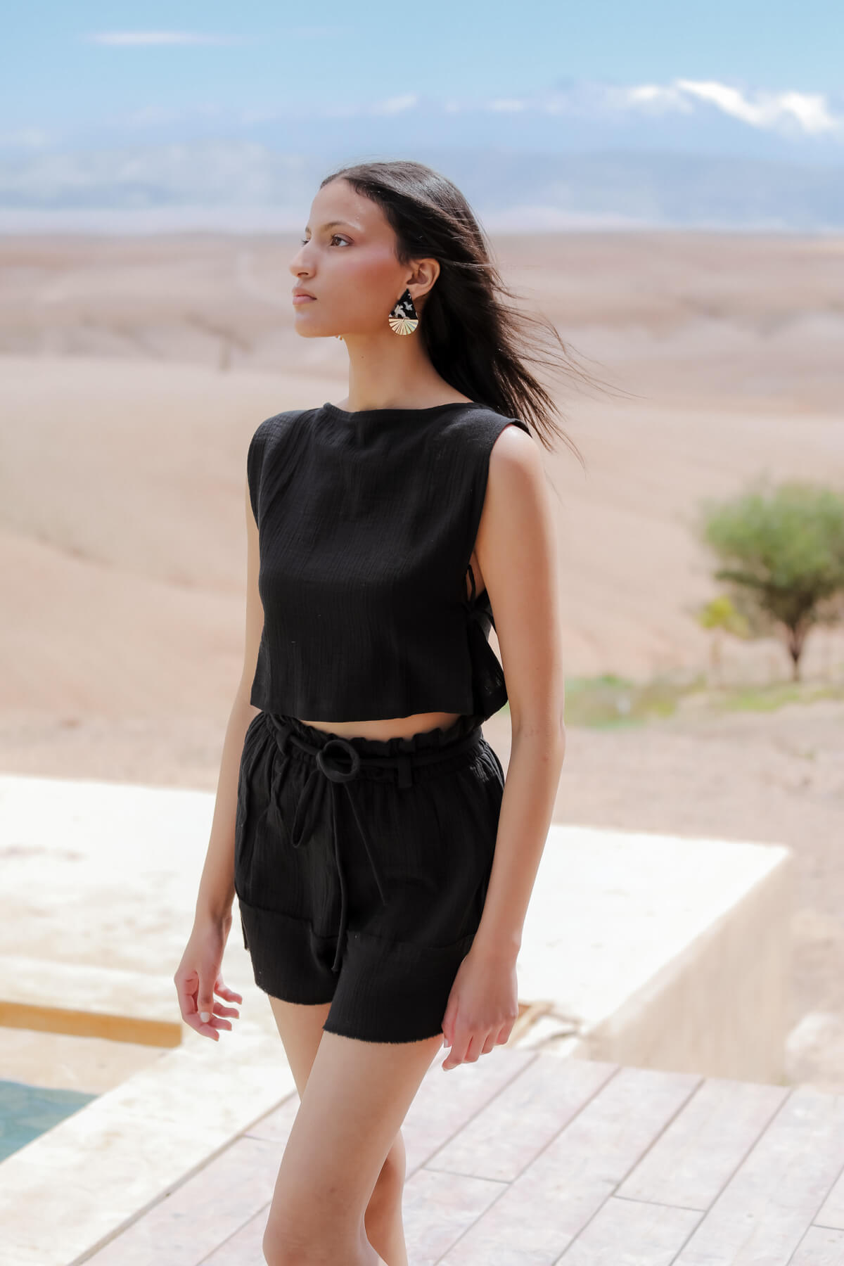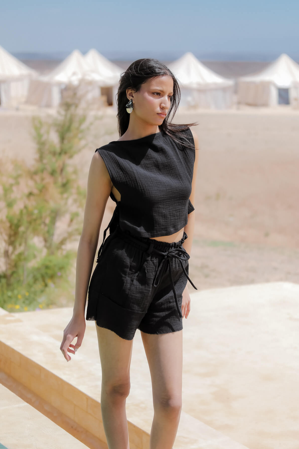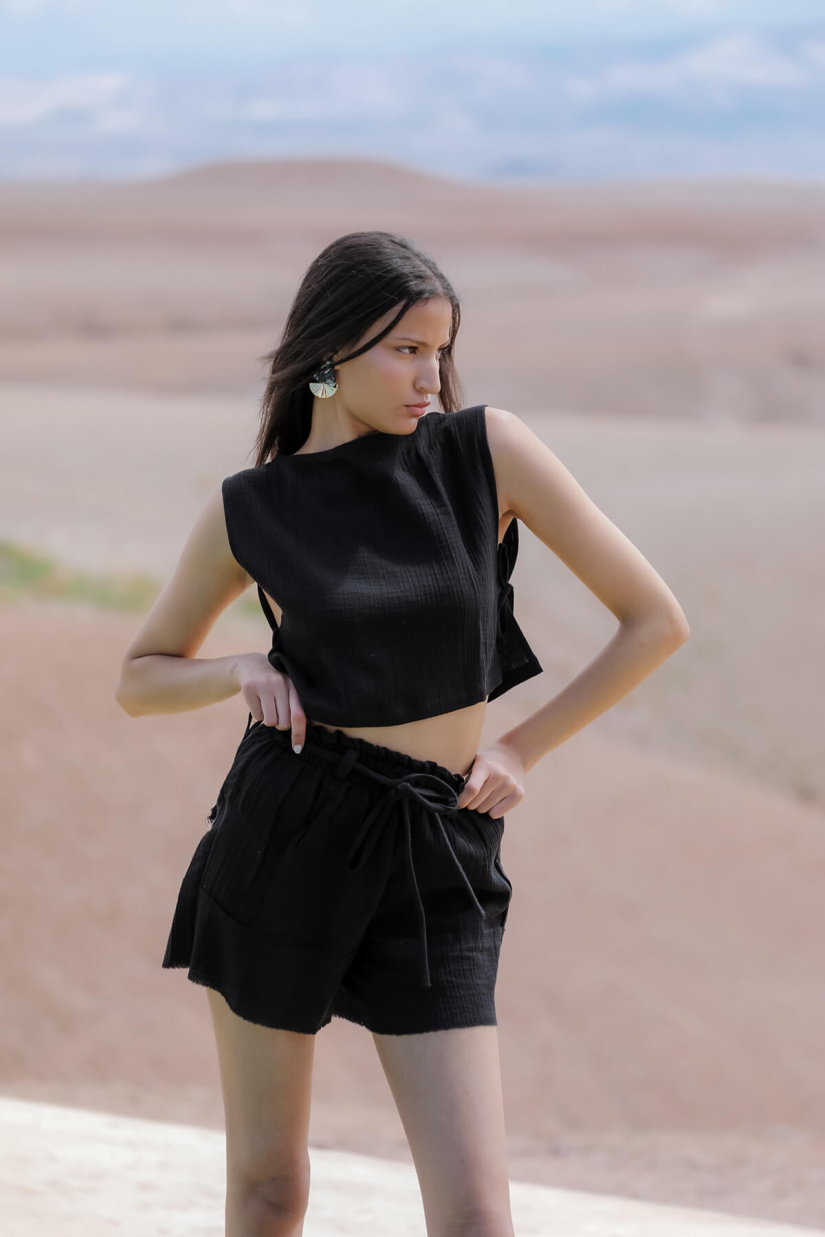 RABBA %100 Pamuk Siyah Yandan Bağlamalı Crop ve Şort TAKIM
